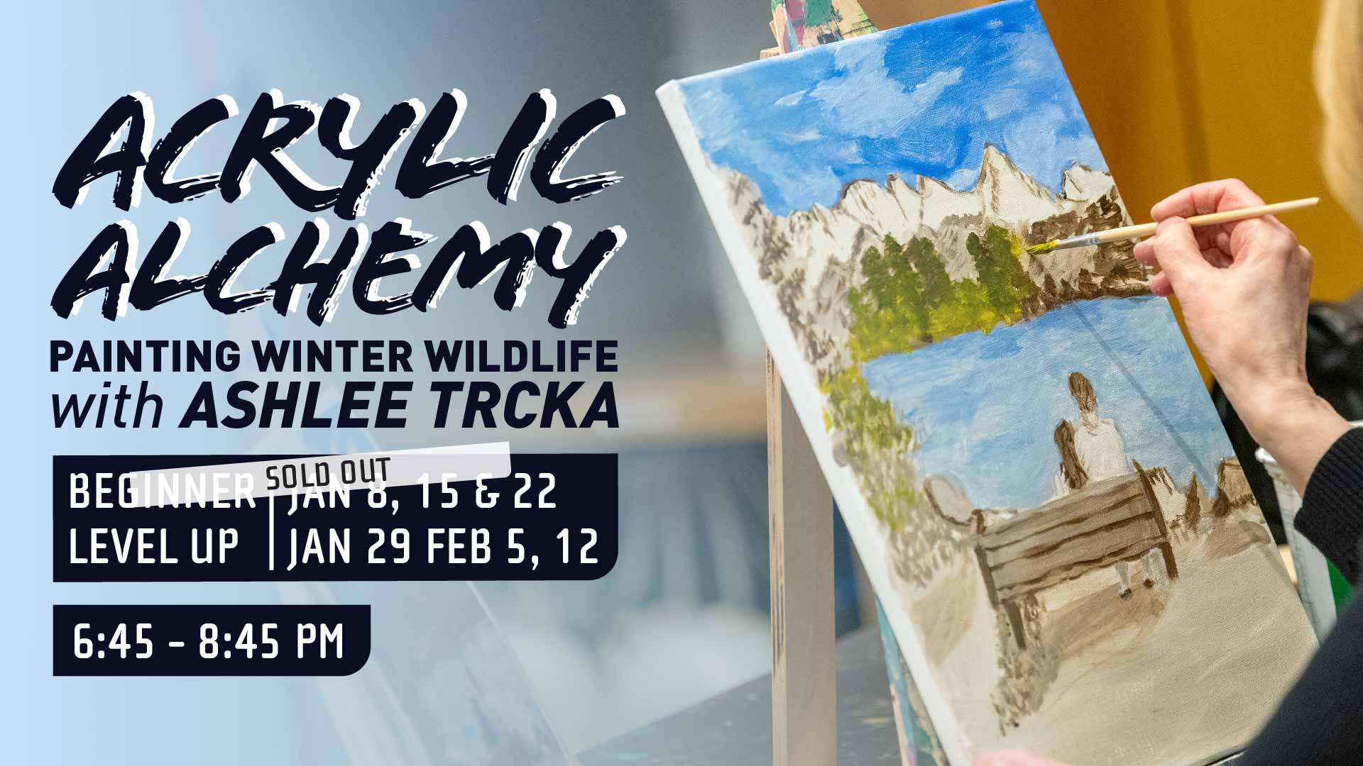 Adult painting class expanding your understanding of the basic principles, materials and techniques using acrylics. Artist & instructor Ashlee Trcka will help you advance from beginner level painting utilizing higher grade material and bolder colour choices.